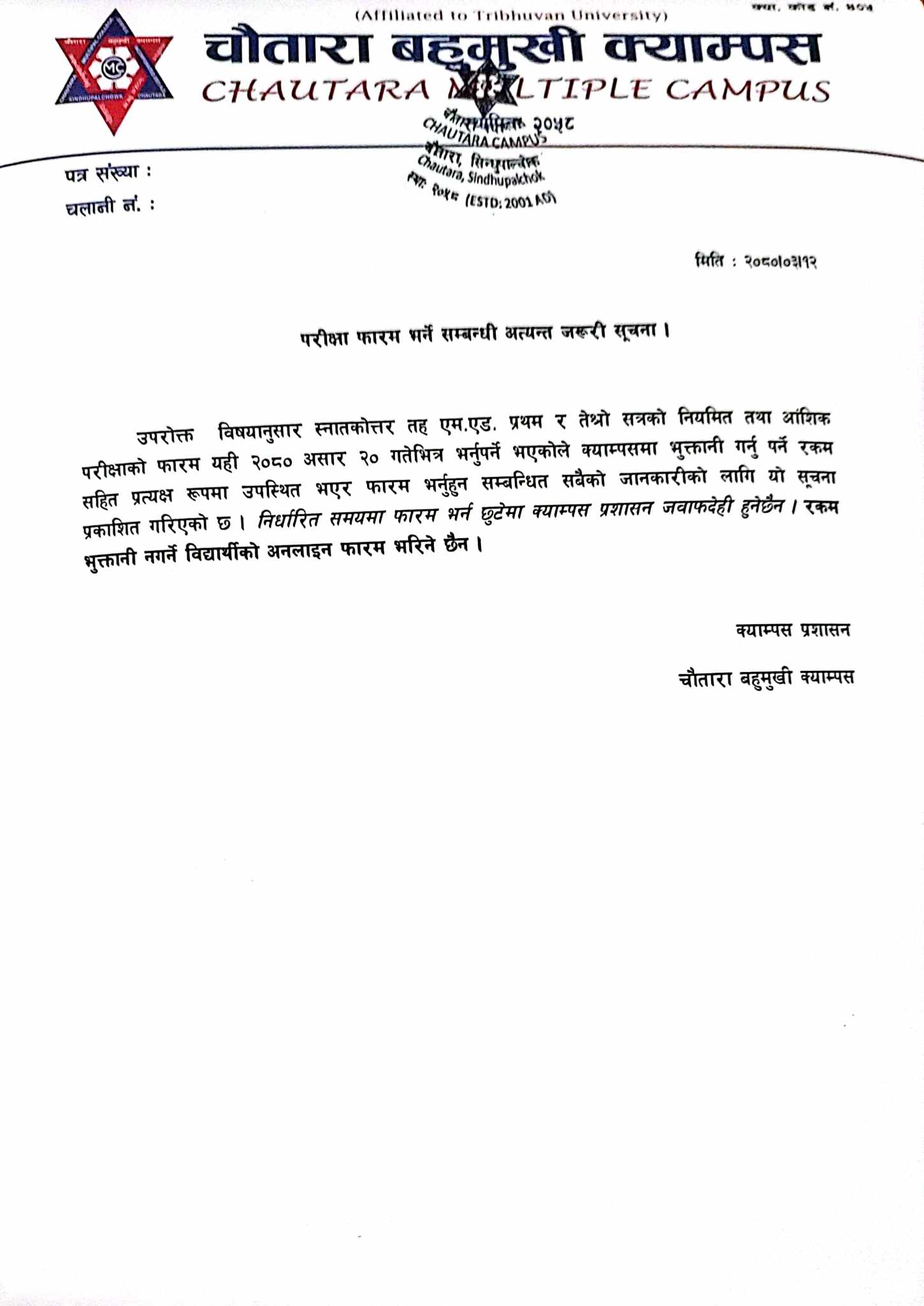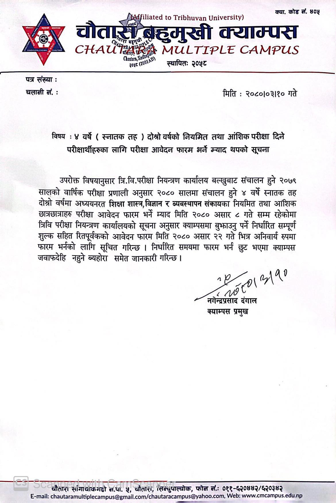 | स्नातक तह दोश्रो वर्षको परीक्षा आवेदन फारम भर्ने म्याद थप सम्बन्धमा । |